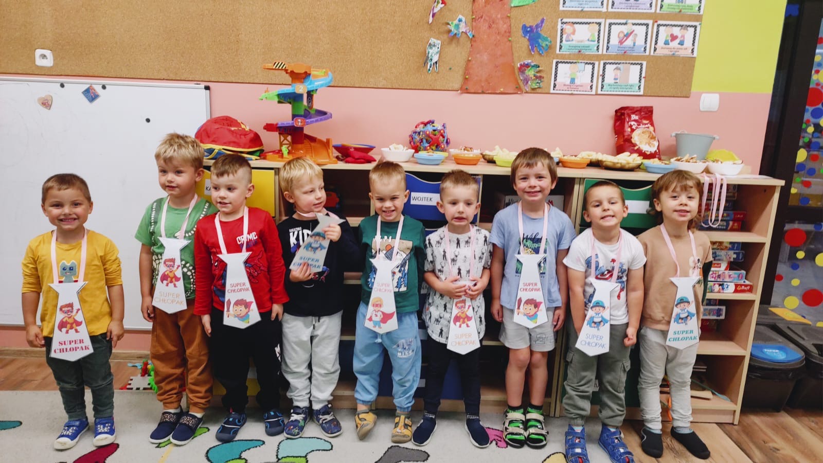 We wtorek 30 września w naszej grupie z okazji Dnia Chłopaka odbyły się drużynowe zabawy sportowe, następnie dziewczynki wręczyły chłopcom drobny prezent: krawat super chłopaka oraz mieliśmy zdrowy poczęstunek przygotowany przez rodziców.