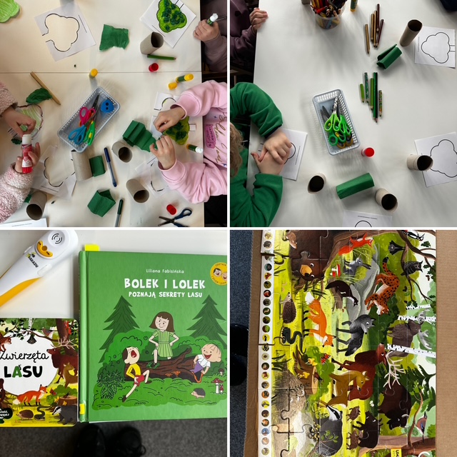 Grupa Puchatki wybrała się na wycieczkę do biblioteki, gdzie uczestniczyła w ciekawych warsztatach. Na początku dzieci z uwagą wysłuchały bajki „Bolek i Lolek poznają sekrety lasu”, która wprowadziła je w świat przyrody i leśnych tajemnic.