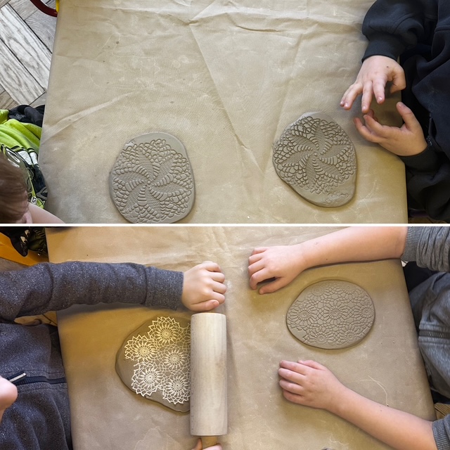 Podczas zajęć przedszkolaki wałkowały glinę, a następnie odciskały w niej różnorodne wzory, tworząc niepowtarzalne prace. Warsztaty były bardzo ciekawe i sprawiły dzieciom wiele radości. Powstały wspaniałe, własnoręcznie wykonane upominki prosto z serca!